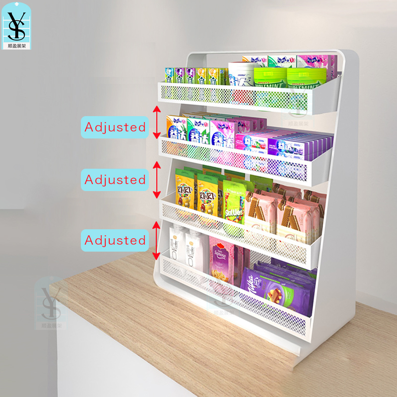 2024 Nouveaux bonbons au détail en métal de conception personnalisée, cosmétique, présentoir de comptoir de préservatif, support de vente au détail de collations de chewing-gum